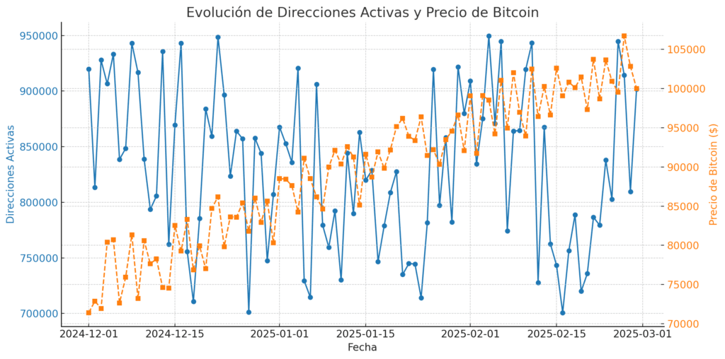 El mercado de Bitcoin podría estar en un momento crucial. El 28 de febrero de 2025, las direcciones activas en la red superaron las 912,300, un nivel no visto desde diciembre de 2024, cuando Bitcoin alcanzó los $105,000. Este incremento sugiere un cambio en la dinámica del mercado. ¿Estamos ante una posible reversión de tendencia?