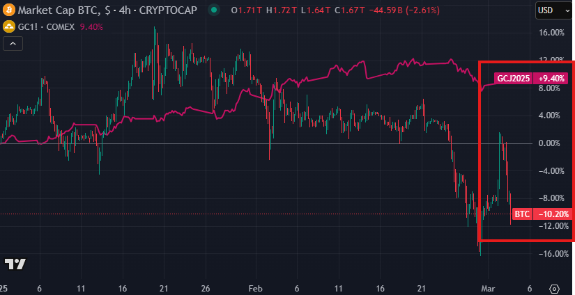 Bitcoin (BTC) ha experimentado una caída abrupta de $10,000 en 24 horas, situándose en $82,000, en medio de una creciente incertidumbre macroeconómica. Mientras tanto, el oro continúa marcando máximos históricos, fortaleciendo su papel como activo refugio tradicional. Este comportamiento ha reabierto el debate sobre si Bitcoin sigue cumpliendo su papel como cobertura en tiempos de crisis.