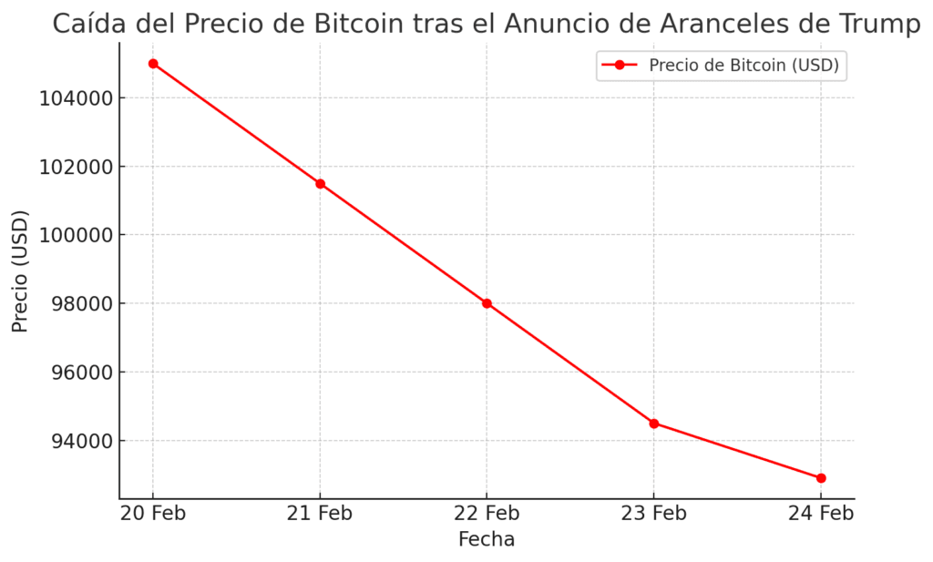 El gráfico muestra la fuerte caída de Bitcoin tras el anuncio de los aranceles, reflejando la volatilidad actual en el mercado cripto.