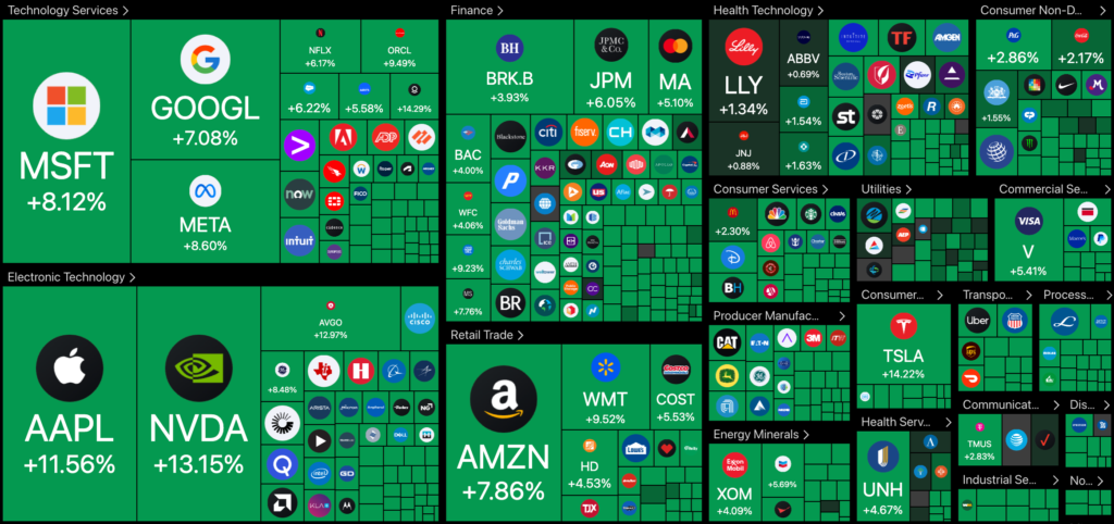 Las acciones se recuperan tras la suspensión de los aranceles de Trump. Fuente: TradingView
