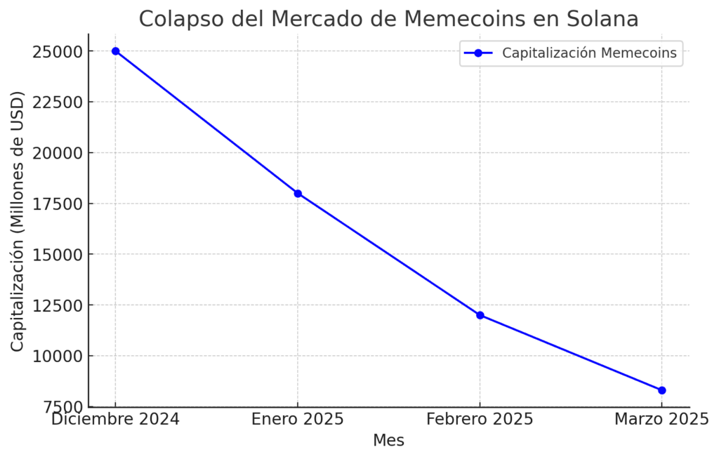 Durante finales de 2024, Solana experimentó un auge de memecoins, alcanzando una capitalización de $25,000 millones. Sin embargo, en los últimos meses, este mercado ha colapsado hasta $8,300 millones, con una caída del 23% en solo 24 horas.