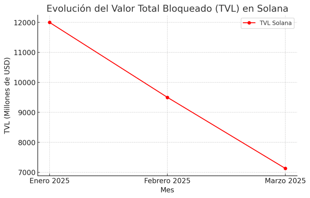 El Valor Total Bloqueado (TVL) mide la cantidad de liquidez en los protocolos de una blockchain. En enero de 2025, el TVL de Solana era de $12,000 millones, pero ha descendido hasta $7,130 millones, evidenciando una menor confianza en la red.